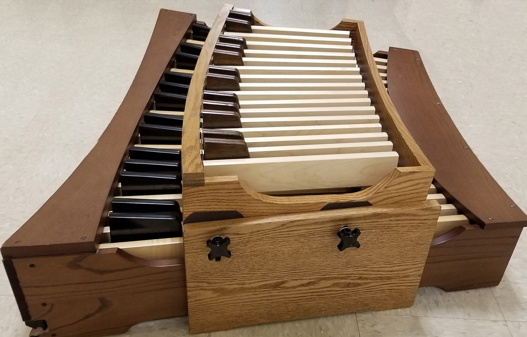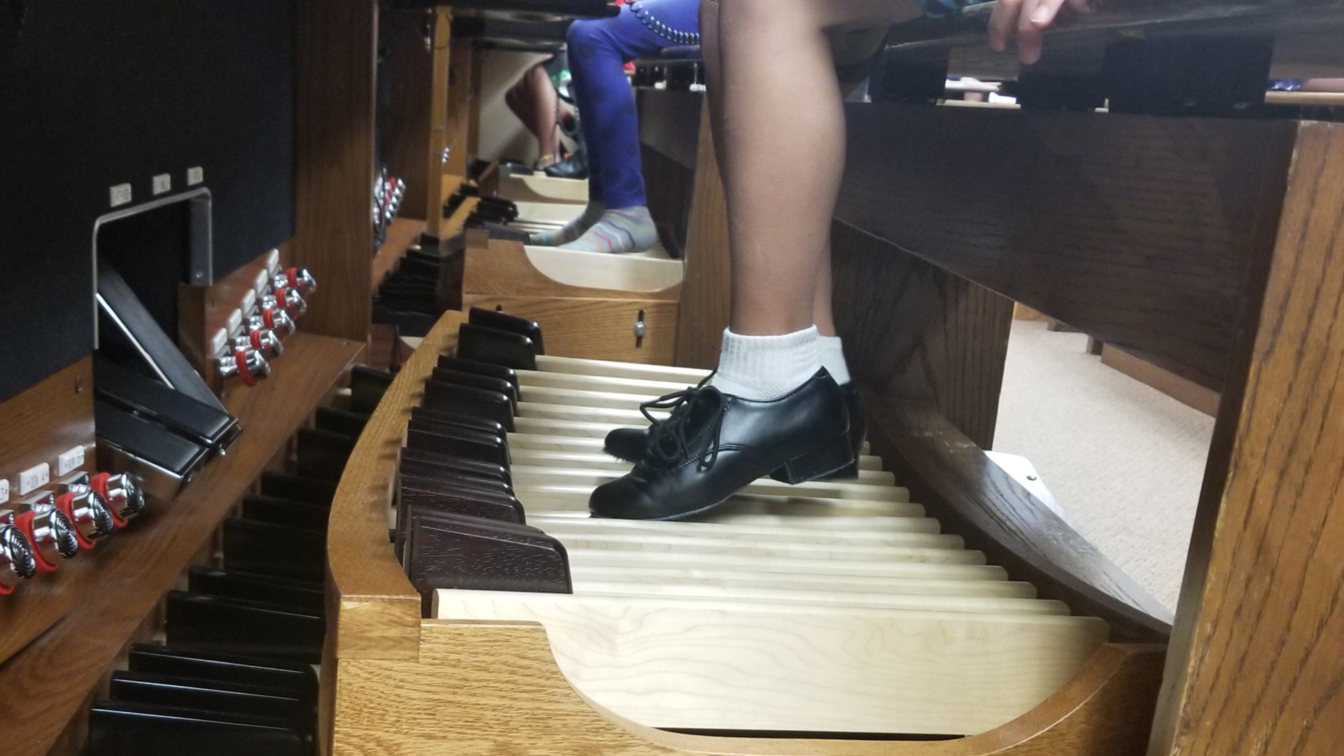 Thirteen children, ages eight through eleven, are enrolled in a special class designed to teach the basics of music at the organ. The children have had little or no held in the The new 28-key Organ Pedal Booster hovers above a standard AGO pedalboard (with sides perpendicular to the floor), bringing the keys six inches closer to young feet. Its weight is suspended by two outer supports that rest on the floor, enabling the Booster keys to gently depress the host pedal keys with felt-tipped dowels. Spring tension for each key is still controlled by the host pedalboard as the Booster keys rest lightly on top. The entire Booster pedalboard adjusts up and down, and each dowel is also adjustable up-down, left-right to compensate for slight differences in host pedalboard dimensions.